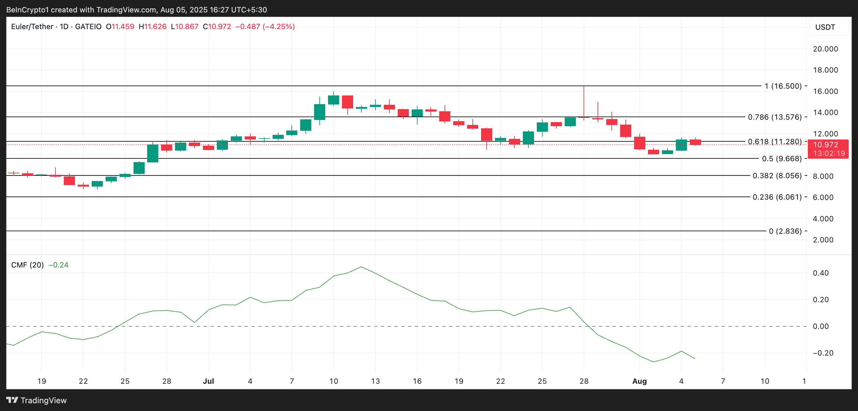 På den annen side, som med EUL, når CMF blir negativ, er salgspresset sterkere, noe som peker på potensiell nedadgående momentum.
