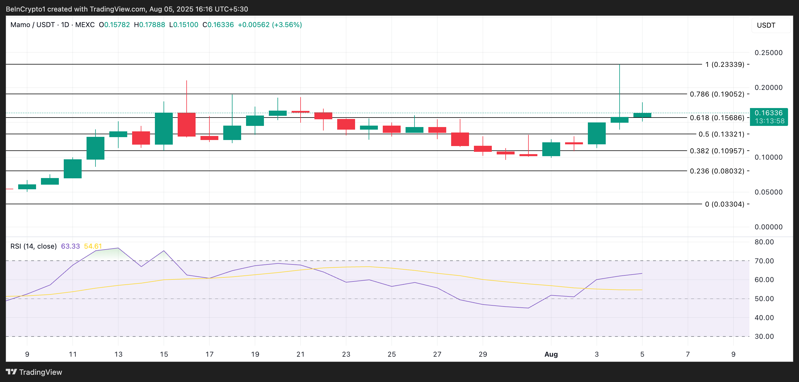 I løpet av den siste uken har MAMOs pris steget nesten 40 %, med avlesninger fra dens Relative Strength Index (RSI) som antyder en ytterligere oppgang på kort sikt. I skrivende stund er denne momentumindikatoren, som måler en aktivas oversolgte og overkjøpte markedsforhold, på 63,23 og i en oppadgående trend.