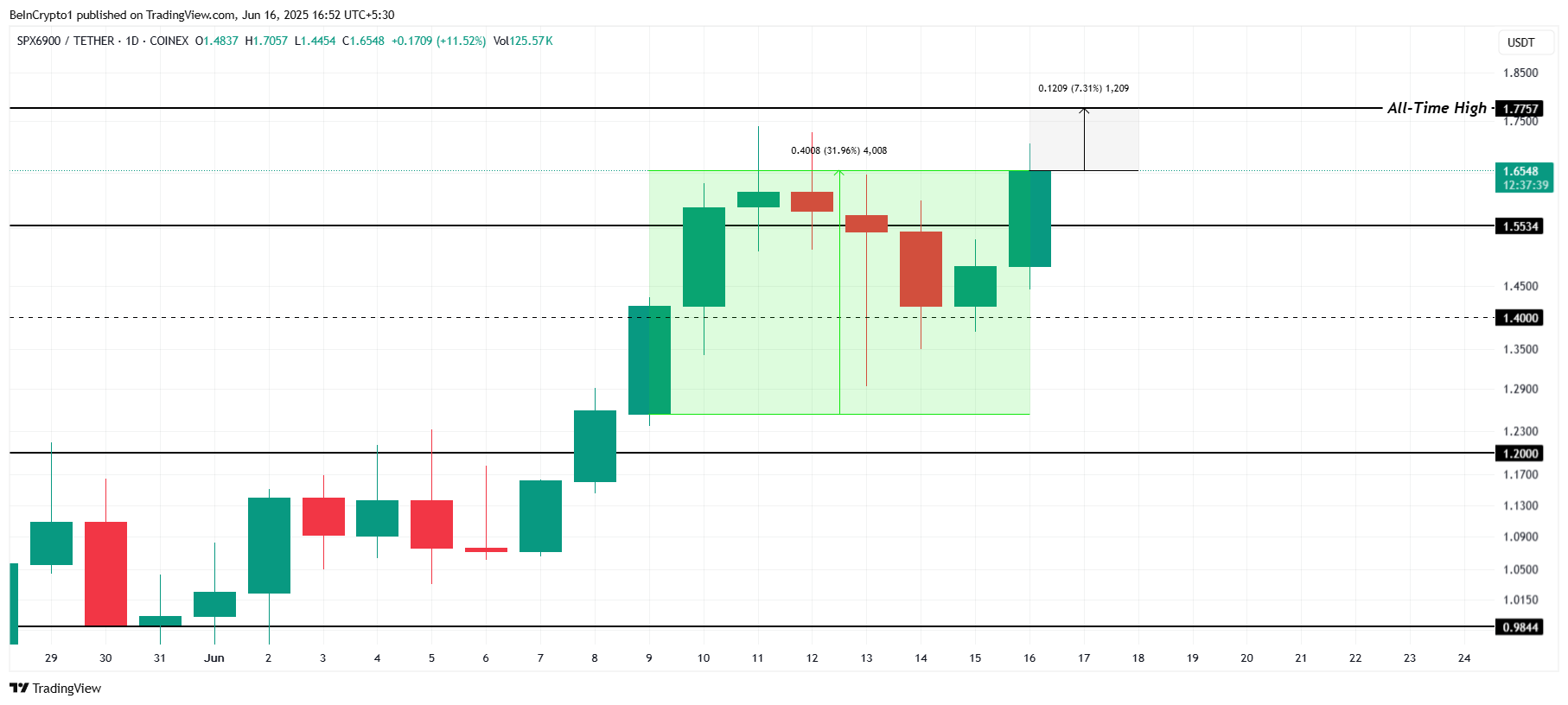 SPX kurs har økt med nesten 32 % denne uken, og handles til $ 1,65. Den er nå litt over 7 % unna å bryte sin all-time high (ATH) på $ 1,77. Denne imponerende prisbevegelsen viser altcoinens voksende momentum, og tiltrekker seg oppmerksomhet fra tradere og investorer som søker ytterligere gevinster på kort sikt.