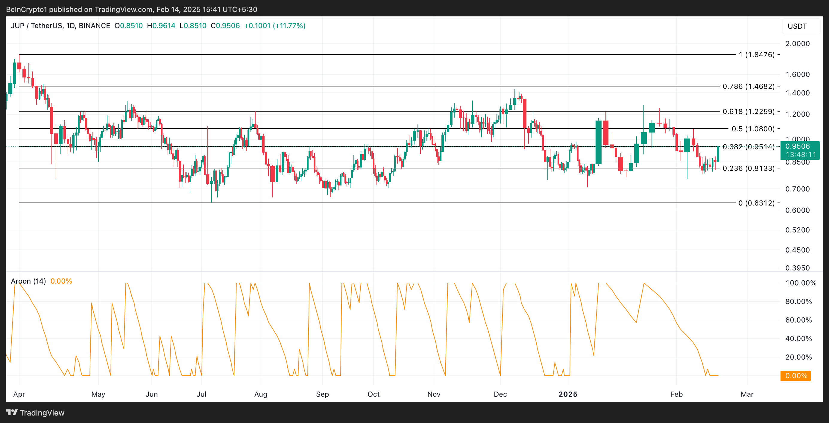 Imidlertid antyder oppsettet av dens Aroon-indikator at prisøkningen kanskje ikke er sterk. I skrivende stund er JUPs Aroon Up-linje på 0 % på dagsgrafen.