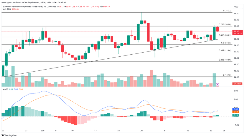 I tillegg er Moving Average Convergence Divergence (MACD) positiv, noe som reflekterer en svakt bullish momentum for tokenet. Hvis dette opprettholdes, kan ENS kurs bryte $ 30,00 motstanden og nå $ 34,32