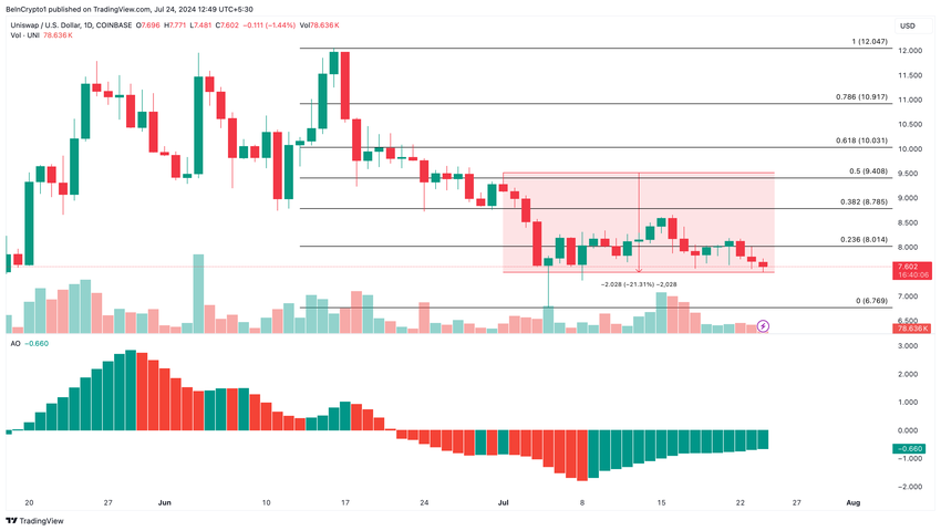 Men Uniswaps bullish skjevhet kan ikke materialisere seg hvis ETHs kurs underpresterer. Hvis dette skjer, kan tokenets pris falle til $ 6,76