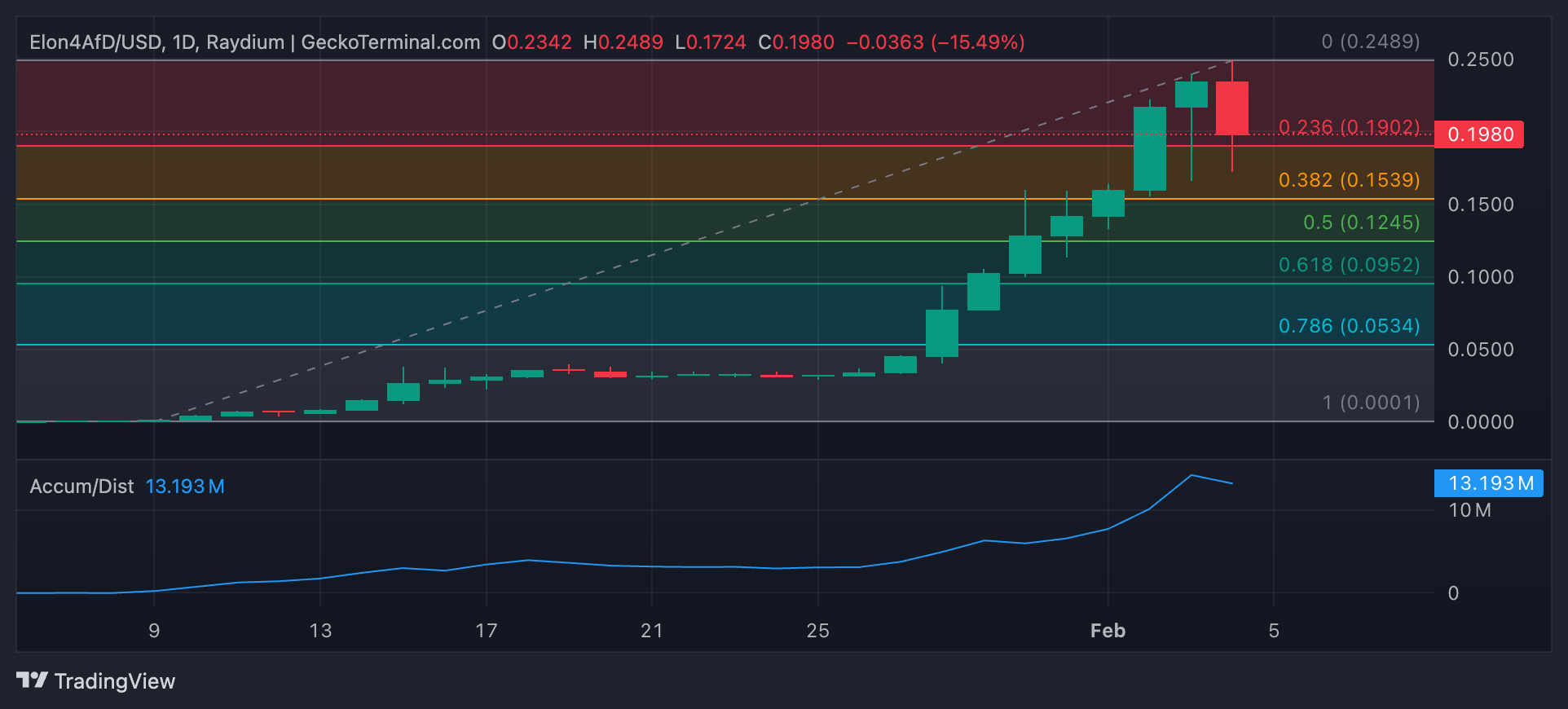 ELON4AFD er en trending altcoin i dag fordi den kortvarig handlet på en all-time high på $ 0,24 under den tidlige asiatiske handelssesjonen. Selv om den siden har korrigert med 24 %, fortsetter markedsdeltakere å akkumulere altcoinen.