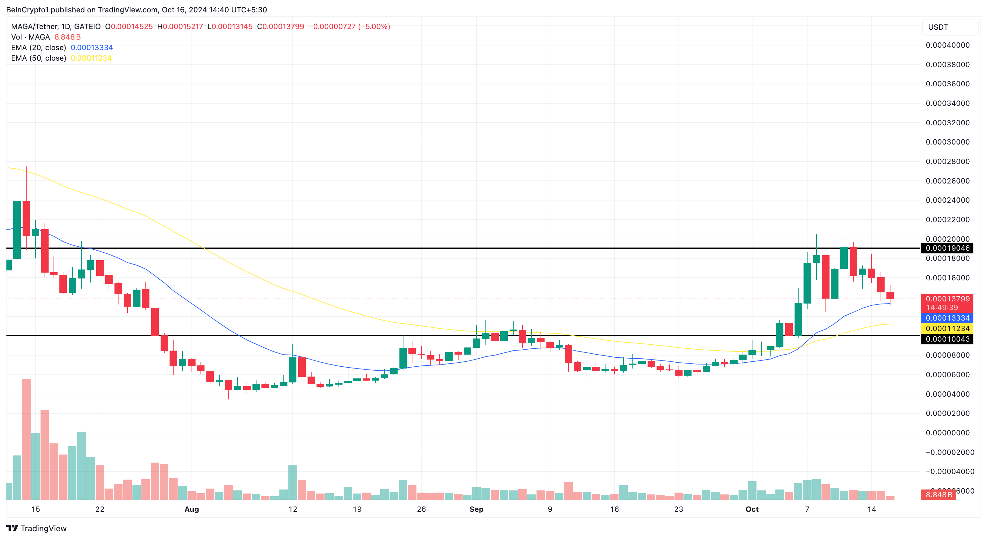 Imidlertid har MAGAs pris falt med 17 % i løpet av de siste syv dagene, og handles nå til $ 0,00013. Den ligger nå nær 20-dagers eksponentiell glidende gjennomsnitt (EMA), som ofte signaliserer en bearish trend når den brytes. Hvis MAGAs pris faller under dette nøkkelstøttenivået, kan neste mål være $ 0,00010, noe som indikerer en dypere korreksjon og ytterligere bearish momentum.