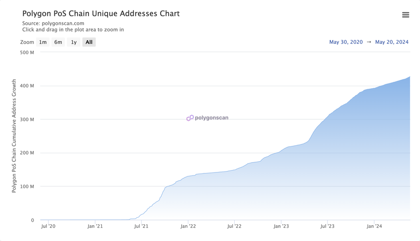 Polygon-nettverket fortsetter å se en økning i antall unike adresser, noe som gjenspeiler vedvarende interesse og brukerdeltakelse.