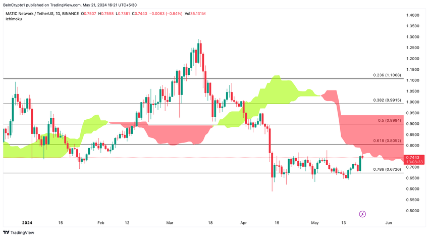 Målnivå på $ 0,8052: Hvis MATIC går inn i den daglige Ichimoku-skyen, er det opprinnelige målet $ 0,8052, et betydelig motstandsnivå.