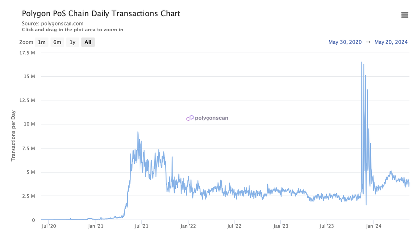 Diagrammet over daglige transaksjoner viser betydelig aktivitet i Polygon-nettverket, med markante topper som indikerer perioder med høy bruk.