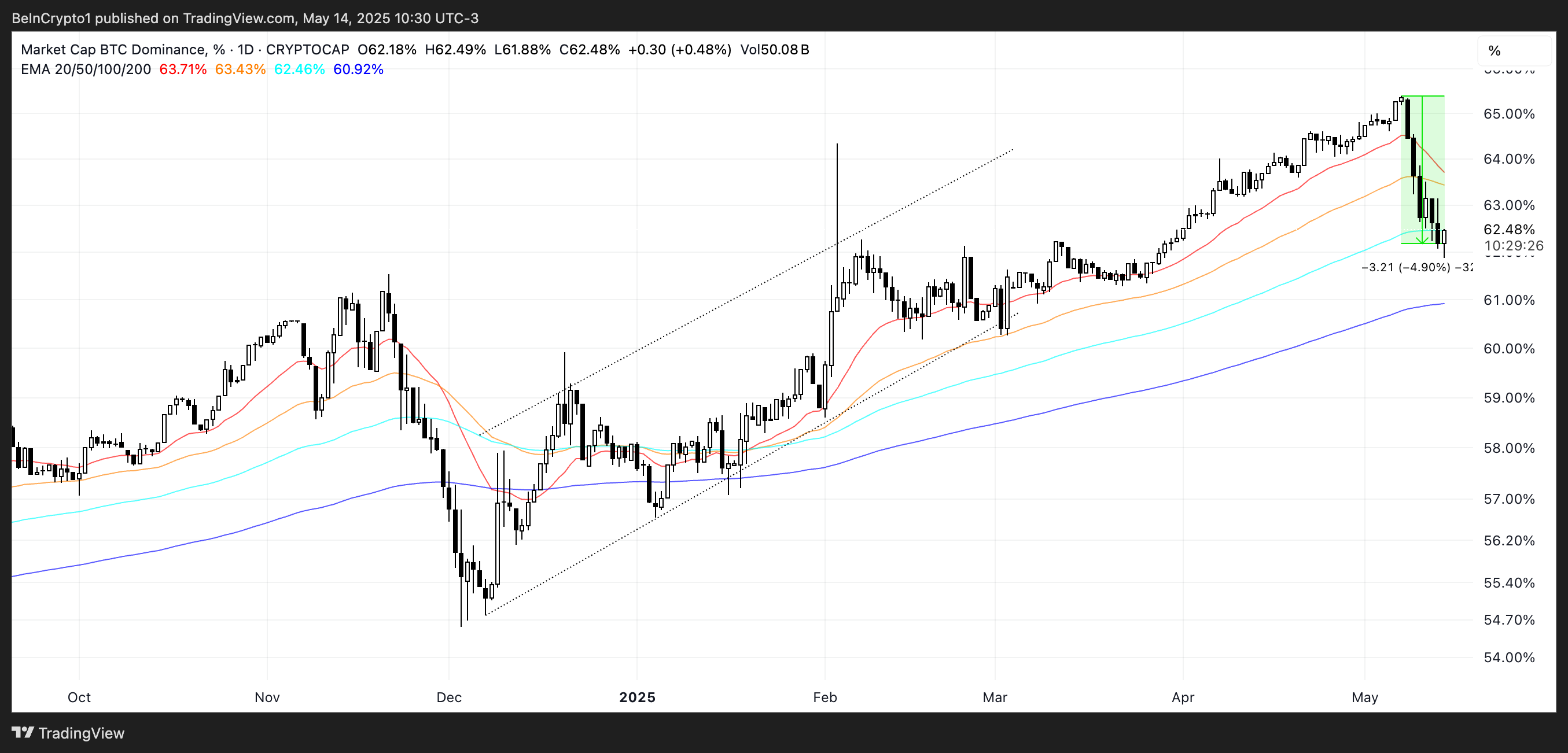 Bitcoin-dominansen har falt kraftig de siste seks dagene, fra 65,39 % til 62,5 %—en nedgang på nesten 5 basispunkter og det laveste nivået siden 31. mars.