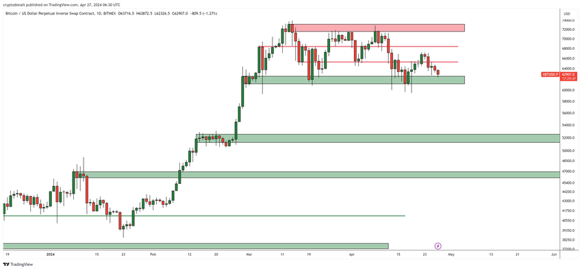 Teknisk analytiker DonAlt uttrykker bekymring for $ 63,000 – $ 61,000 støtteprisområdets tilbakevendende tester, som kan svekkes.