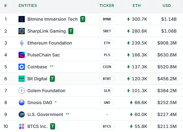 Nåværende ledere inkluderer Bitmine Immersion Tech med 300 700 ETH og SharpLink Gaming som holder 280 600 ETH.