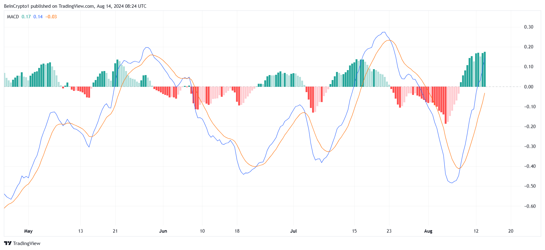 Aptos opplever for øyeblikket en sterk bullish kryssing på sin Moving Average Convergence Divergence (MACD)-indikator, noe som antyder at aktivets momentum styrkes. Dette tekniske signalet indikerer at kjøpere tar kontroll, og det kan være ytterligere oppadgående bevegelse i nær fremtid.