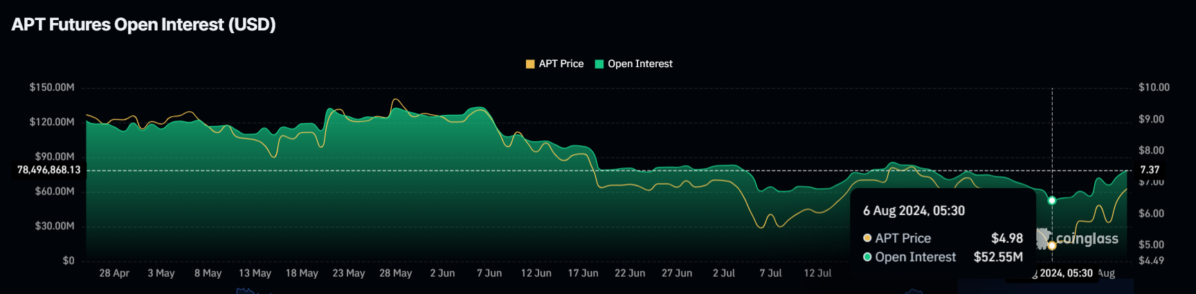 I tillegg til det positive MACD-signalet, ser det ut til at Aptos-entusiaster blir stadig mer selvsikre i aktivet. Denne voksende optimismen reflekteres i den betydelige økningen i Open Interest (OI), som har økt med 50 % i løpet av den siste uken. OI har hoppet fra $ 52 millioner til $ 78 millioner, noe som fremhever en økning i nye posisjoner og større markedsdeltakelse.
