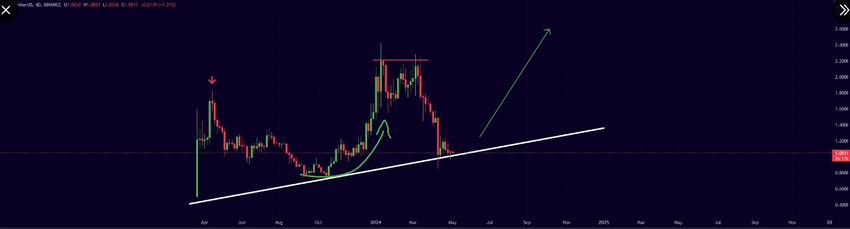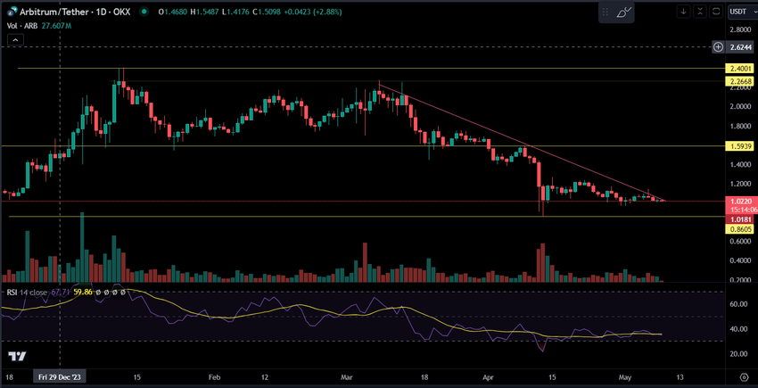 Prisen på Arbitrum (ARB) har sett en betydelig tilbaketrekning fra den siste 2024-toppen på $ 2.40. Prisen ligger for tiden på $ 1.02. Representerer en prisnedgang på 65% fra den siste toppen.