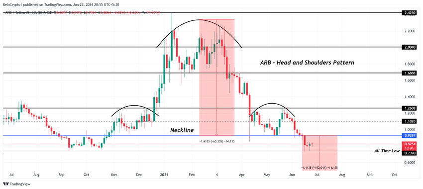 Arbitrums pris observerer dannelsen av et hode- og skuldremønster. Hode- og skuldremønsteret er en bearish diagramformasjon som indikerer en potensiell trendreversering. Den består av tre topper: en høyere midttopp (hode) mellom to nedre topper (skuldre).