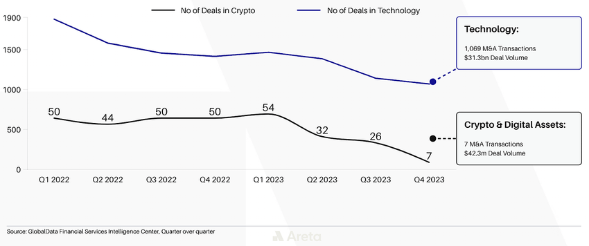 Arbitrum, Ethereums største Layer 2, har den nest største statskassen blant DeFi-prosjektene. Den finansielle styrken gjør det unikt posisjonert til å utforske sjeldne M&A-muligheter i kryptobransjen. GlobalData viser at det kun ble gjennomført syv M&A-transaksjoner i kryptosektoren i 4. kvartal 2023, sammenlignet med 1 069 i den bredere teknologisektoren.