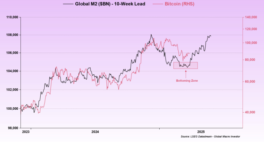 Raoul Pal delte et diagram som korrelerer den globale M2 pengemengden og Bitcoins pris. Basert på historien har Bitcoin en tendens til å stige rundt 10 uker etter at M2 øker, med Pals analyse som antyder at Bitcoin snart kan gå inn i en bullish fase.