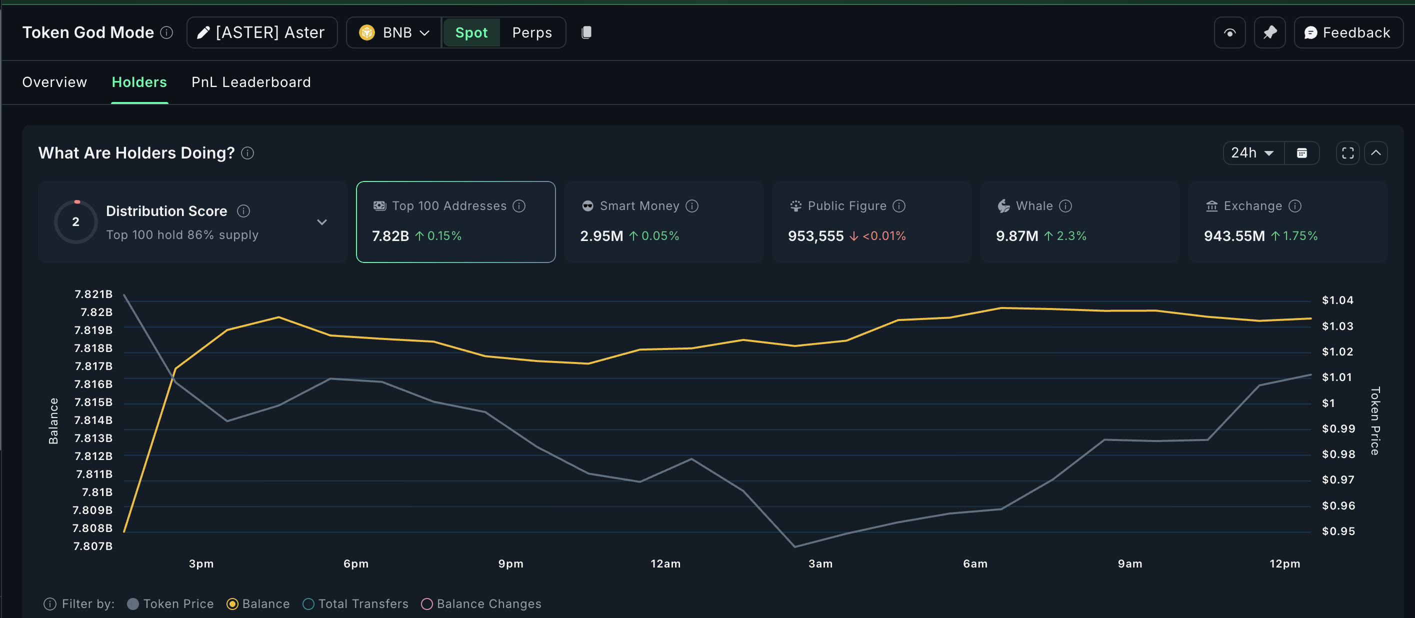 I mellomtiden har mega-hvaler — de 100 største adressene — lagt til 0,15 % til sine beholdninger, og plukket opp omtrent 11,7 millioner ASTER, noe som bringer deres totale beholdning til 7,82 milliarder ASTER.
