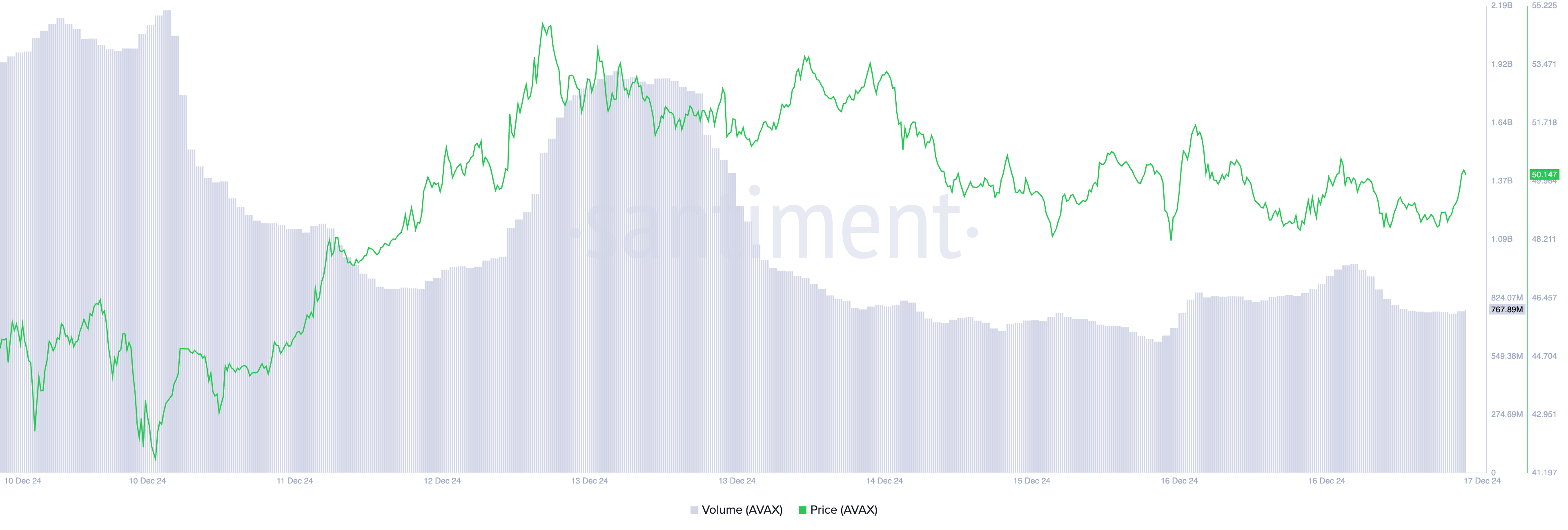 Mens AVAX token kurs har steget med 3 % de siste 24 timene, tyder nedgangen i handelsvolum på at oppgangen gjenspeiler bredere markedsvekst snarere enn faktisk etterspørsel etter altcoinen.