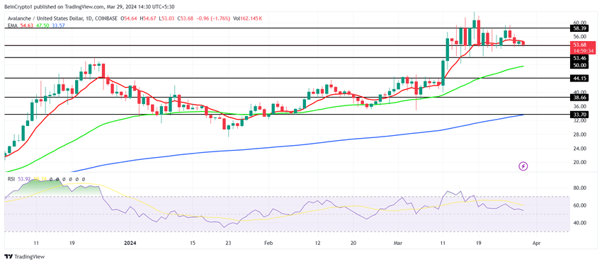 Lavineprisen, som handles til $ 53, er satt til å miste støtten som er merket på samme prisnivå; dette vil resultere i at kryptovalutaen sannsynligvis tester $ 50. Imidlertid, hvis salget intensiveres eller bearish momentum får styrke, vil denne støtten også gå tapt, og presse AVAX ned mot $ 47, som er sammenløpet med det 100-dagers eksponentielle glidende gjennomsnittet (EMA).