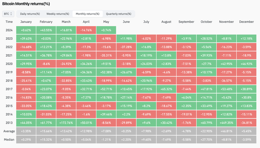 Perioden fra juni til august har historisk sett vært den nest sterkeste tremånedersperioden, med en gjennomsnittlig avkastning på 3,2 %. I valgår øker den gjennomsnittlige avkastningen til 7,3 %, og S&P 500 stiger 75 % av tiden. I mellomtiden er Bitcoins gjennomsnittlige avkastning i valgår 23,68 %.