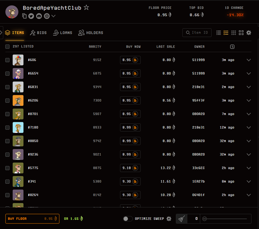 I skrivende stund oppgir Blur BAYCs pris som 8,95 ETH. I mellomtiden viser OpenSea, en annen stor NFT-markedsplass, en litt høyere pris på 9,49 ETH.