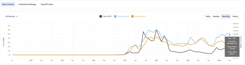 Videre har det generelle NFT-markedet sett en nedgang. De tre beste blokkjedenettverkene – Ethereum, Bitcoin og Solana – opplevde over 40 % nedgang i 30-dagers salgsvolum. Mai så et fall på over 50% i månedlig NFT-salgsvolum sammenlignet med april, med salg som falt fra over 1,24 milliarder dollar til 616,67 millioner dollar.