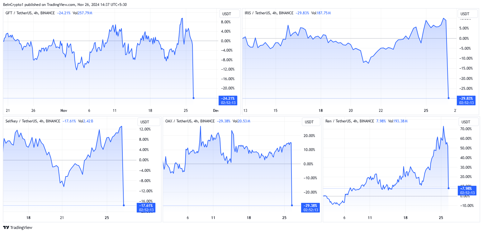 Umiddelbart etter denne runden med avnotering, har GFT, IRIS, KEY, OAX og REN priser stupt. Denne ustabiliteten skyldes sannsynligvis at investorer mister tillit til tokens’ fremtidsutsikter når avnoteringene skjer, noe som kan føre til ytterligere salg.