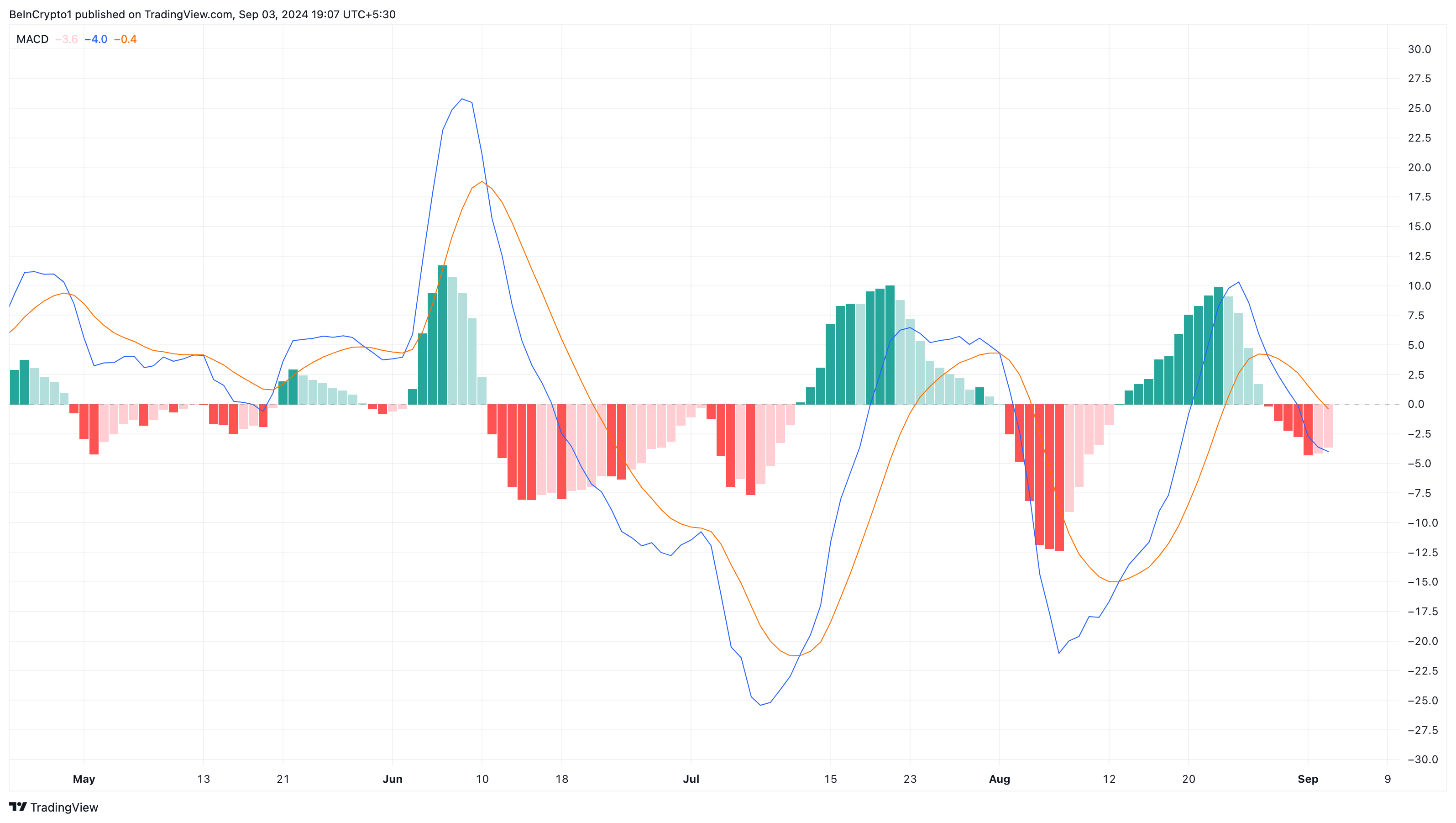 Når avlesningen er positiv, er momentumet bullish, og det kan være et tidlig signal. En negativ avlesning antyder derimot at momentumet er bearish. Som vist nedenfor er MACD på BNB/USD daglig diagram negativ.