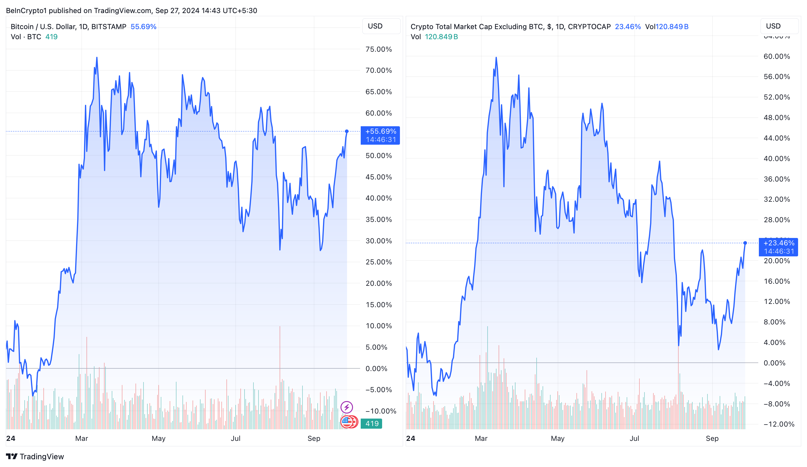Midt i Bitcoins dominerende markedsposisjon, forblir institusjonell fokus hovedsakelig rettet mot den, ofte på bekostning av andre lovende altcoins. Hittil i år har Bitcoins pris økt med over 55 %, mens den totale kryptomarkedskapitalen, ekskludert Bitcoin, har steget med bare 23 %.