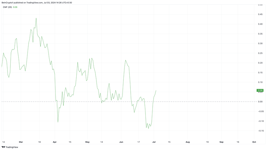 Når CMF stiger, betyr det at akkumulering skjer. Et fall i indikatorens lesing innebærer imidlertid at investorene distribuerer. I skrivende stund er CMF 0,06, noe som indikerer at BNB forlater distribusjonssonen og kan gå mot en høyere pris.