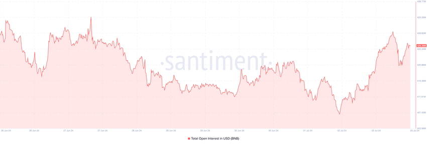 Ifølge Santiment hadde BNBs åpne interesse opprinnelig falt til 420,31 millioner dollar. Men i skrivende stund er verdien 429.29 millioner dollar, noe som indikerer et hopp i spekulativ aktivitet.