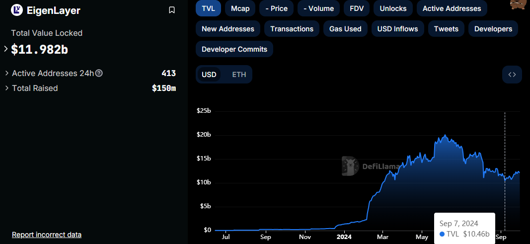 For øyeblikket er TVL på EigenLayer $11,982 milliarder, noe som betyr mer kapital låst i DeFi-protokollen, og tilbyr deltakerne større fordeler og avkastning.