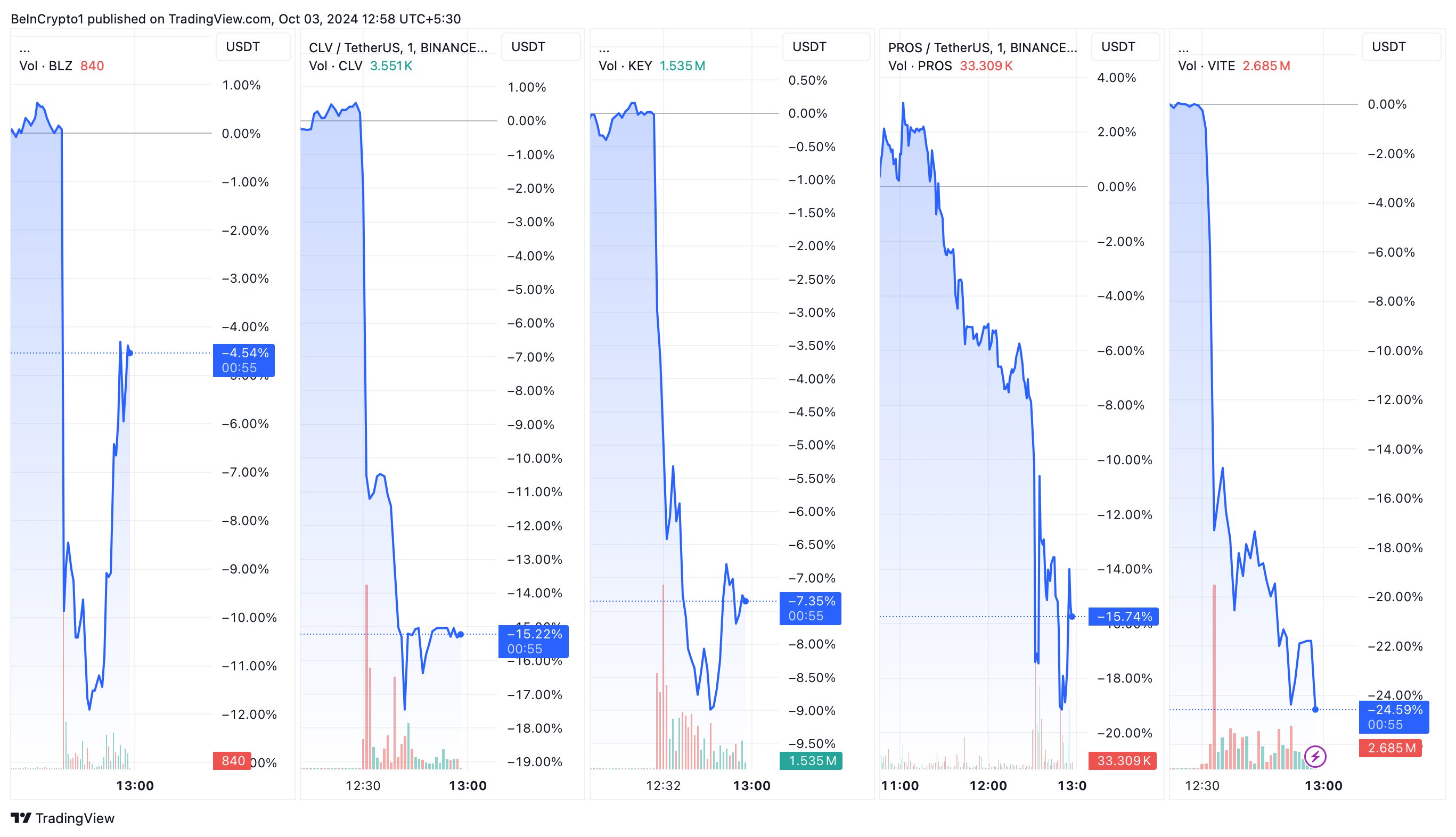 Følgelig utløste denne advarselen et kraftig fall i prisene på disse altcoinsene. VITE så den største effekten, med et fall på nesten 25 %. PROS og CLV fulgte etter med fall på 15,74 % og 15,22 %, henholdsvis.