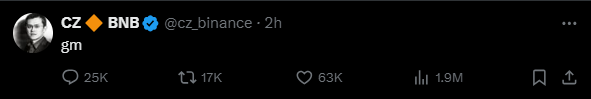 CZs oppdateringer etter fengsel er ennå ikke kommet. Imidlertid delte hans X-konto (tidligere Twitter) et god morgen-innlegg, som fikk nesten to millioner visninger innen de første to timene. Dette reflekterer populariteten som Binance-lederen fortsatt nyter.