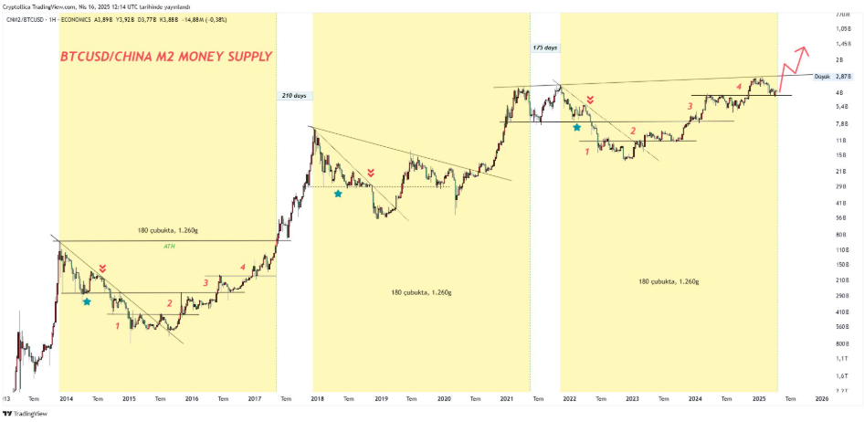 Dette diagrammet antyder at Bitcoin kan følge Kinas M2-trend mot en prisøkning.
