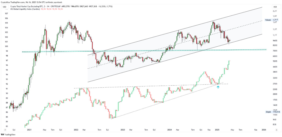 En økning i M2 signalerer større likviditet i det finansielle systemet, noe som antyder at mer penger ofte søker avkastning i mer risikofylte aktiva som Bitcoin og altcoins eller andre, som aksjer og eiendom.