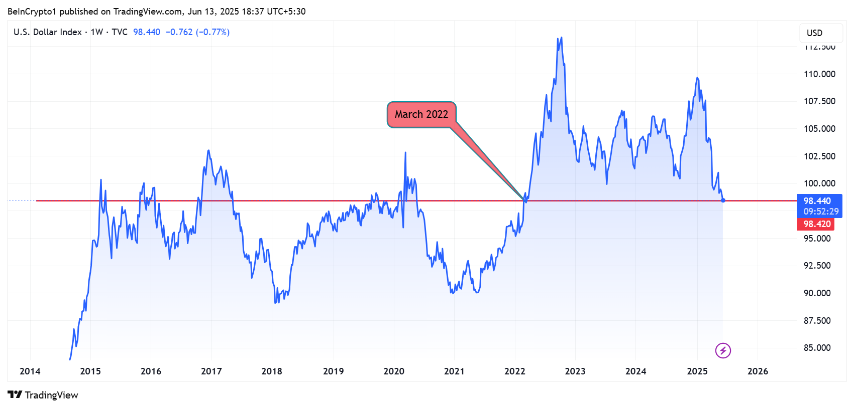 Dette diagrammet viser at US DXY har falt til nivåer sist sett i mars 2022 etter å ha steget over 122-nivået i 2023 og toppet seg rundt 110 i januar 2025.