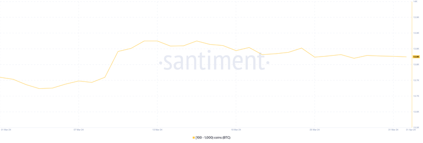 Siden 24. mars har antallet lommebøker som holder mellom 100 og 1,000 BTC, ofte referert til som “hvaler”, holdt seg relativt stabilt og svingt litt mellom 13,872 og 13,841. Stabiliteten tyder på at disse betydelige eierne for øyeblikket ikke akkumulerer flere BTC.