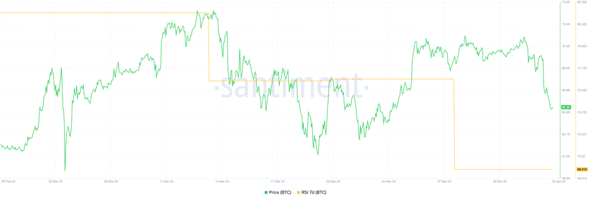 Dette betyr at Bitcoin på 69 er på nippet til å bli ansett som overkjøpt, men stabiliseringen i denne nøytrale sonen indikerer mangel på momentum i begge retninger. For seks dager siden falt RSI fra 76 til 69 da BTC-prisen begynte å stabilisere seg i området $ 68,000 til $ 72,000.