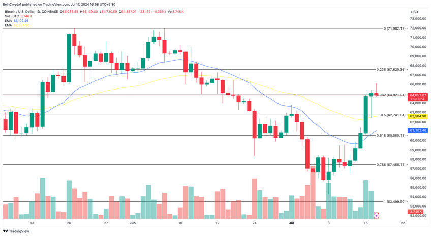 Men siden det er omvendt, er det bullish for BTC, noe som tyder på at prisen kan handles høyere. Hvis den opprettholdes, kan den neste prisen Bitcoin vil nå være rundt $68,235, som vist nedenfor.