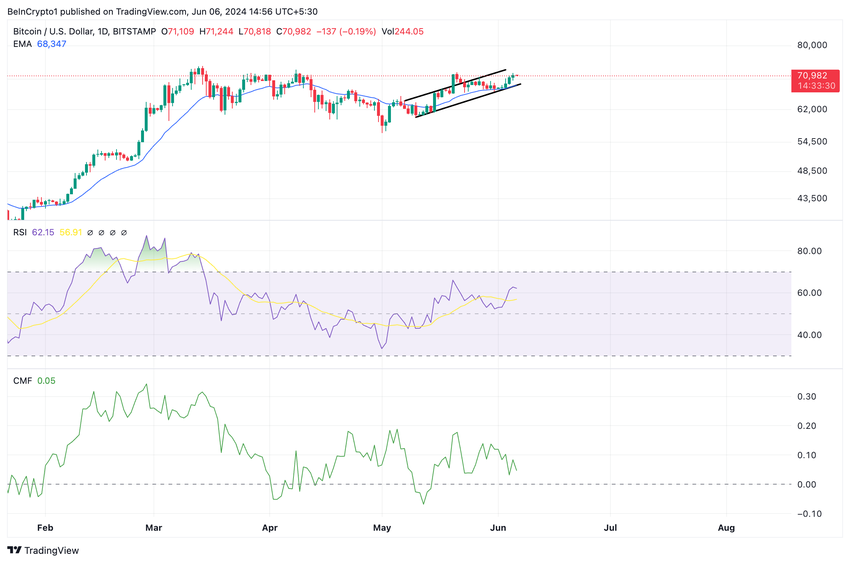 Ved pressetiden var BTCs Relative Strength Index (RSI) i en oppadgående trend. Denne indikatoren måler et aktivaprismoment.