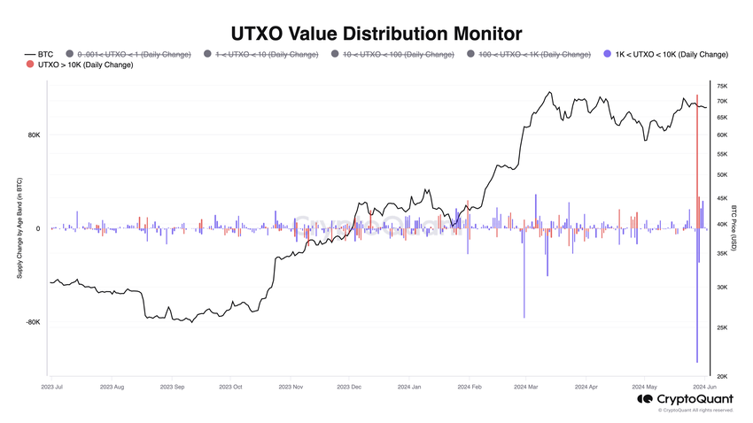 - Røde søyler: Endringer i UTXO-er med mer enn 10 000 BTC.