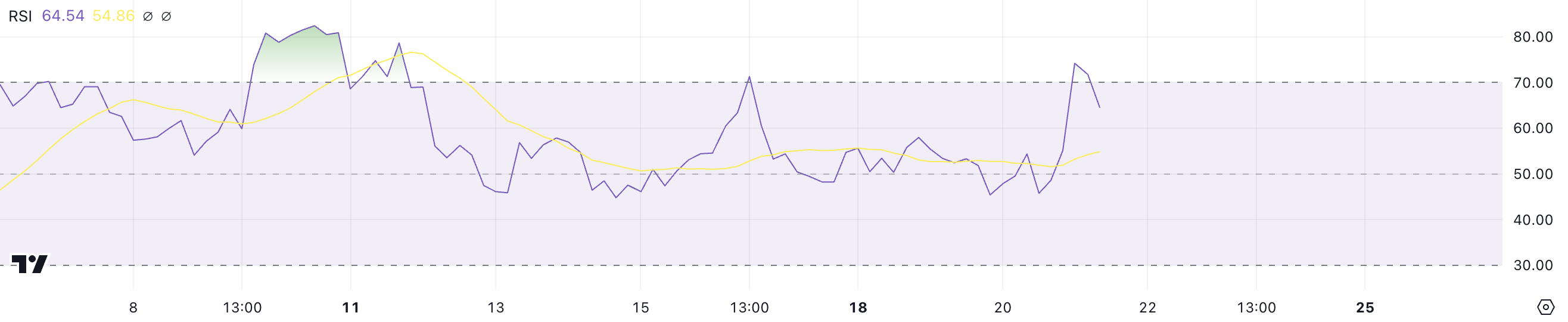 RSI måler hastigheten og størrelsen på prisendringer, med verdier over 70 som indikerer overkjøpte forhold og under 30 som signaliserer oversolgte nivåer. På 64,5 forblir BCH i bullish territorium, noe som støtter den pågående opptrenden.