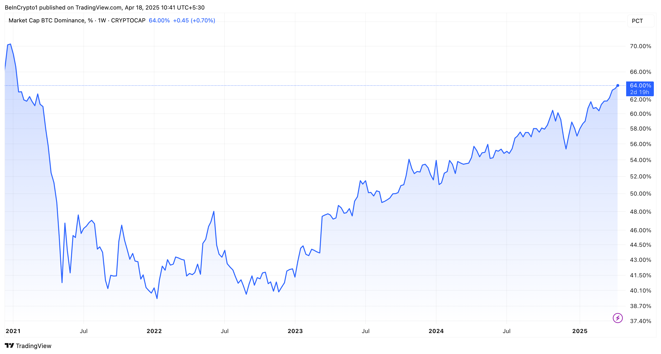 Bitcoins (BTC) markedsdominans har økt til 64 %, og har nådd sitt høyeste nivå på over fire år.