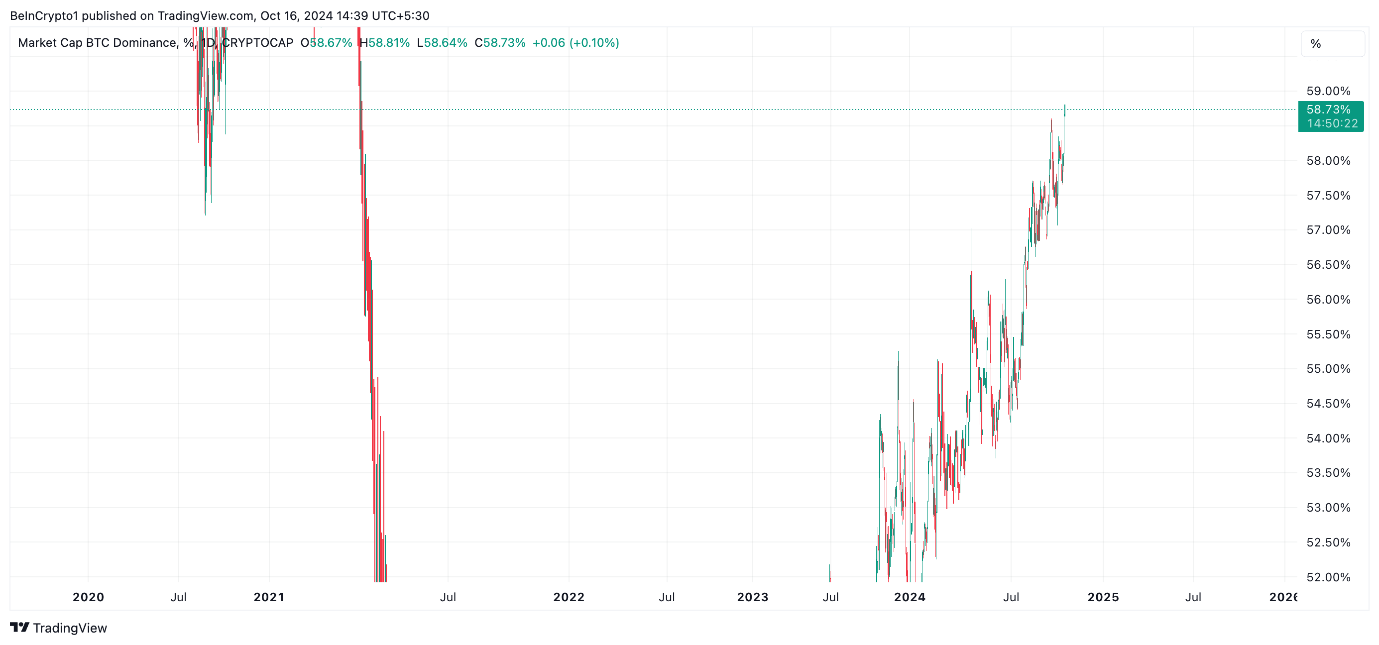 Bitcoins dominans måler den ledende myntens markedsverdi i forhold til den totale markedsverdien av alle andre kryptovalutaer. I skrivende stund ligger den på 58,76, det høyeste nivået siden april 2021.