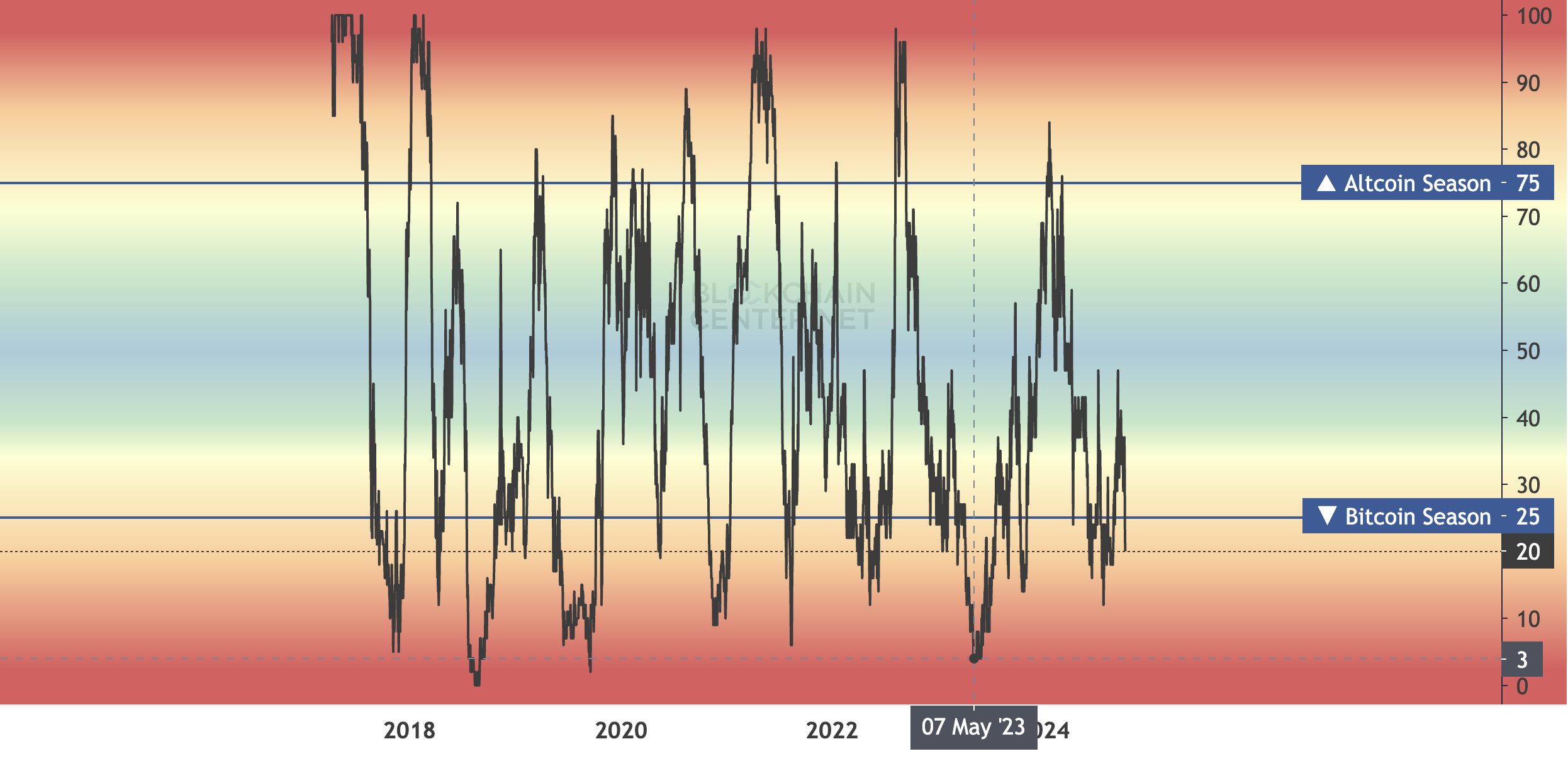 Altcoin-sesongen starter når minst 75 % av de 50 beste altcoins overgår Bitcoins ytelse over en 3-måneders periode. Bare 20 av disse aktivaene har overgått Bitcoins ytelse de siste 90 dagene. Derfor har altcoin-sesongen ennå ikke ankommet.