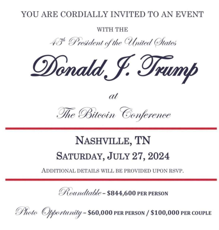 Trump-kampanjens innsamling inkluderer også eksklusive arrangementer for toppdonorer. For eksempel vil den kommende Bitcoin-konferansen 2024 i Nashville inkludere et privat rundebordsmøte med Trump for støttespillere som donerer $ 844,600