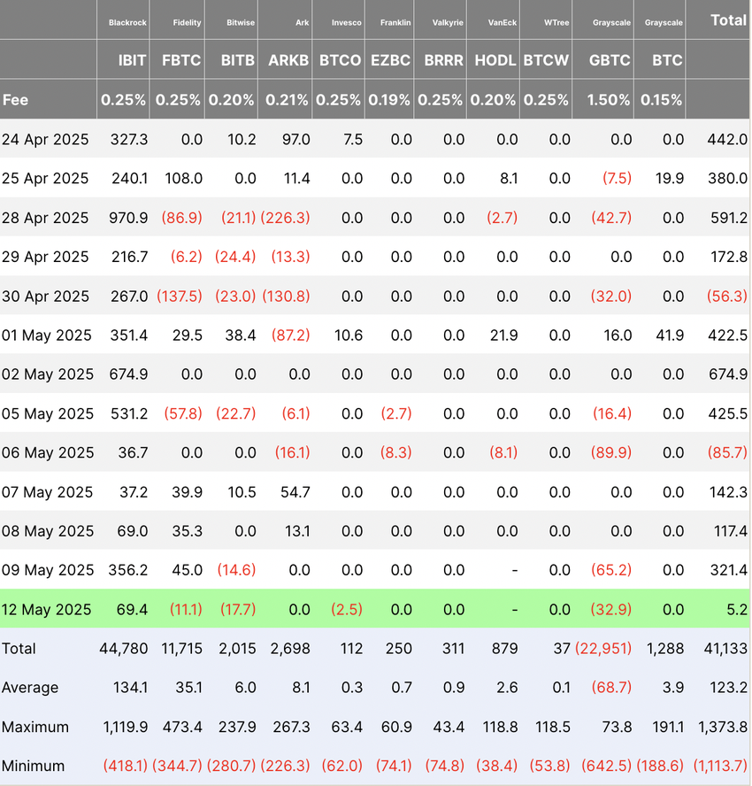 Dette resulterte imidlertid i bare $ 5 millioner i netto innstrømninger til Bitcoin ETF-markedet, det laveste enkeltstående dagsinnstrømningen siden 14. april.