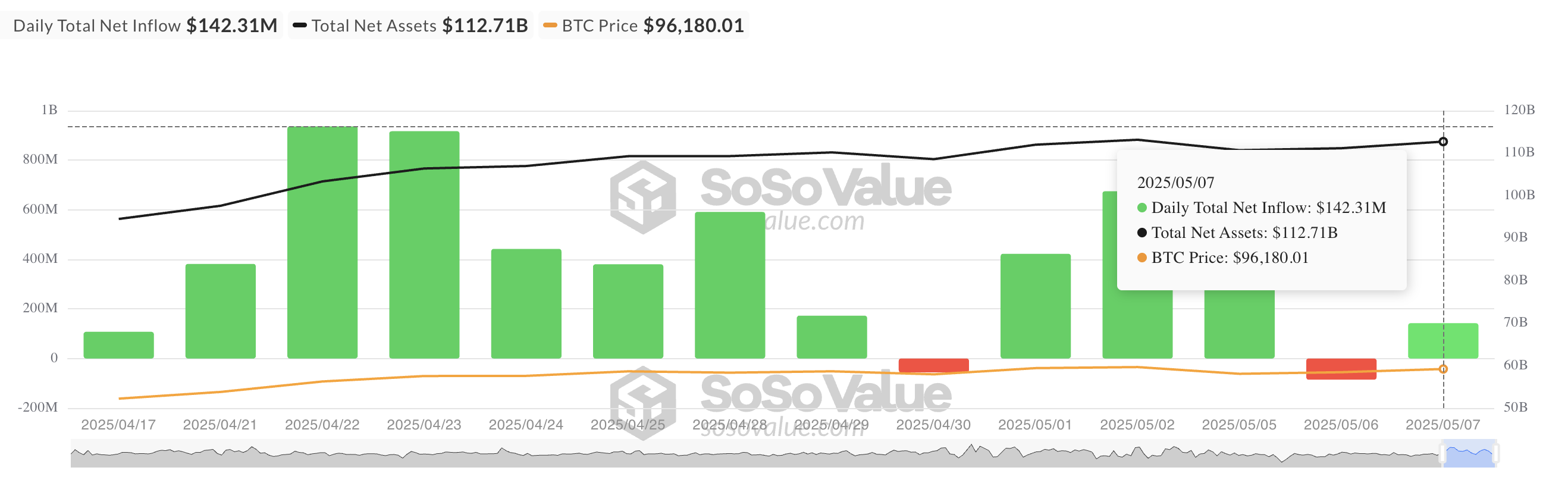 Den 7. mai registrerte Ark Invest og 21Shares’ ARKB den største enkeltstående innstrømningen, totalt $ 57,73 millioner, og brakte den totale kumulative netto innstrømningen til $ 2,68 milliarder.