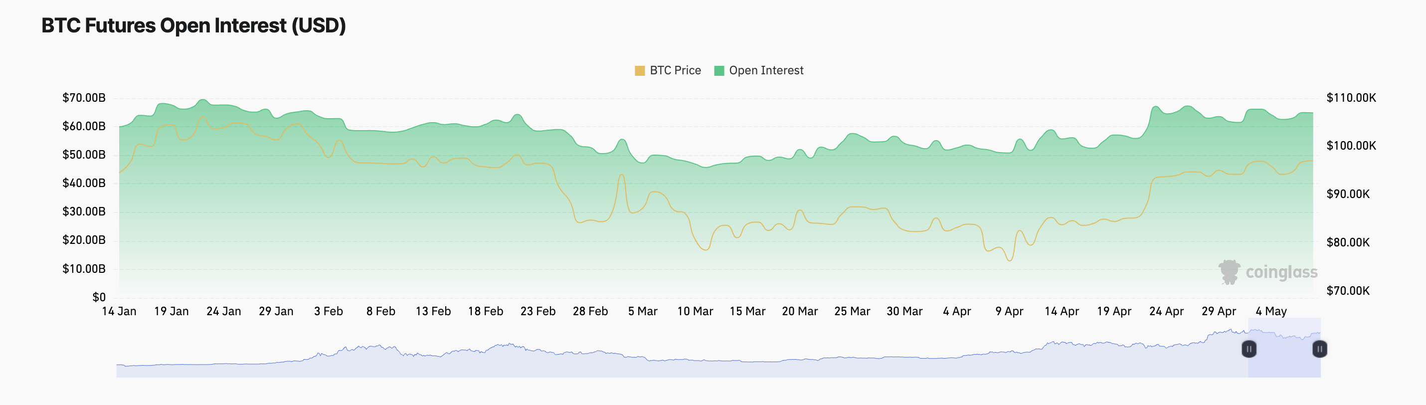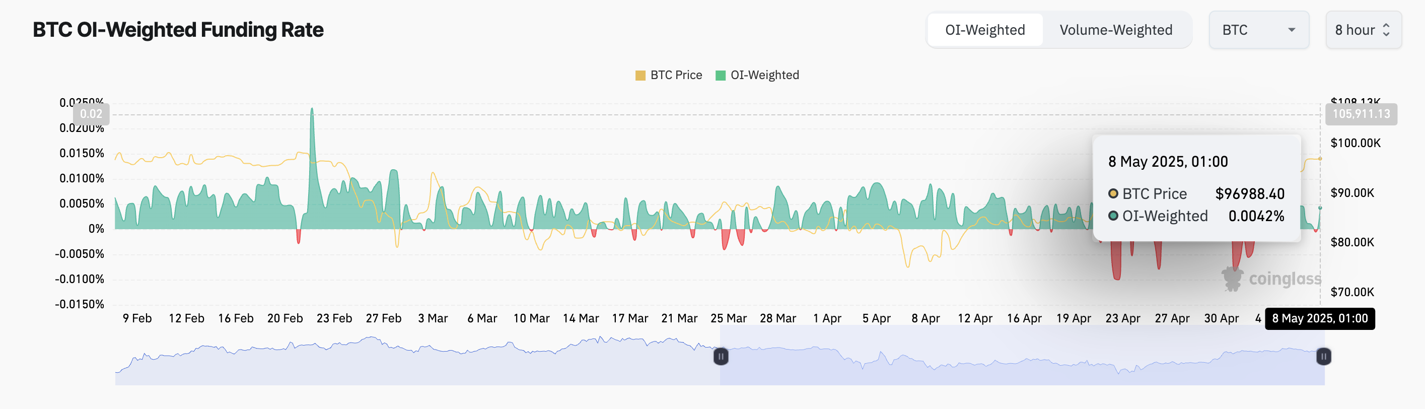 I skrivende stund er denne på 0,0042 %. Finansieringsraten er en periodisk avgift som utveksles mellom long- og short-posisjoner i evige futures-kontrakter for å holde prisene i tråd med spotmarkedet. Når den er positiv som nå, betaler tradere som holder long-posisjoner shorts, noe som indikerer at bullish sentiment dominerer BTC-markedet.